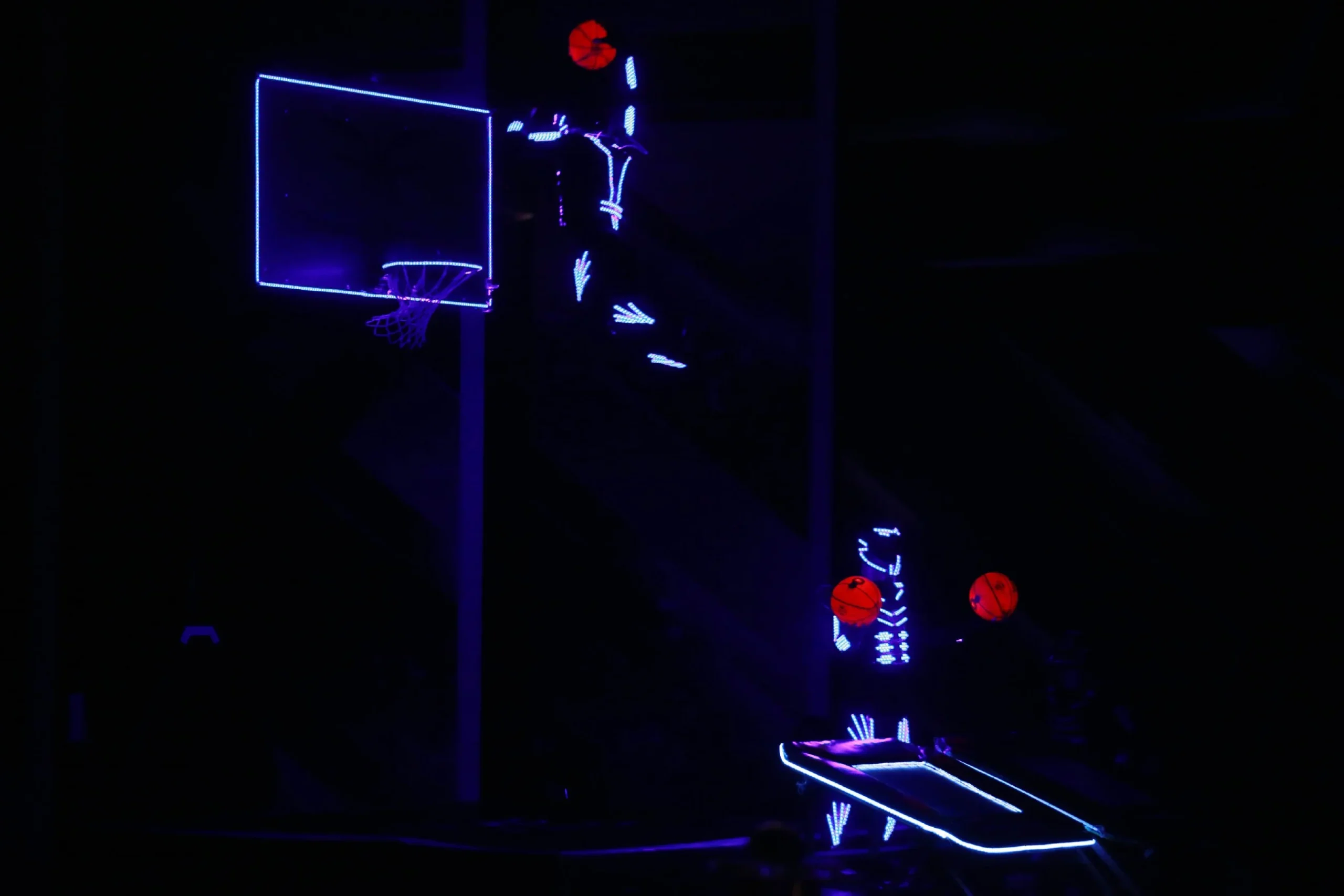 Pripravite se na svetlobno predstavo, ki ste jo videli le v znanstvenofantastičnih filmih. Naš LED Dunk Show združuje vrhunsko akrobatiko in napredno LED tehnologijo v osupljivi koreografiji v temi.